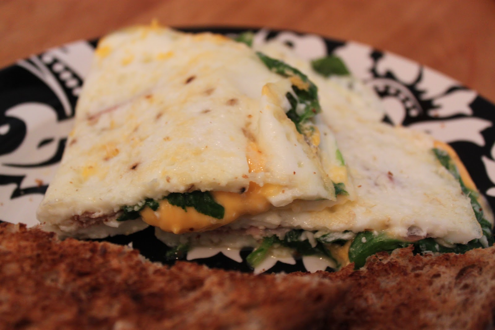 Egg white omelet with spinach, cheese and prosciutto and a slice of sprouted grain toast for breakfast